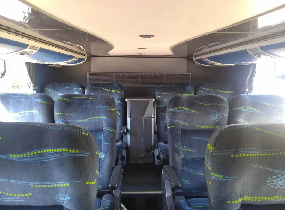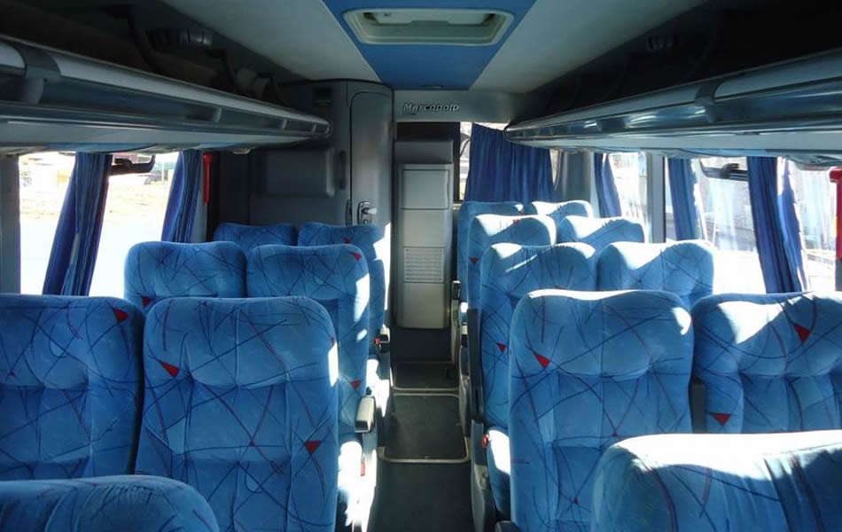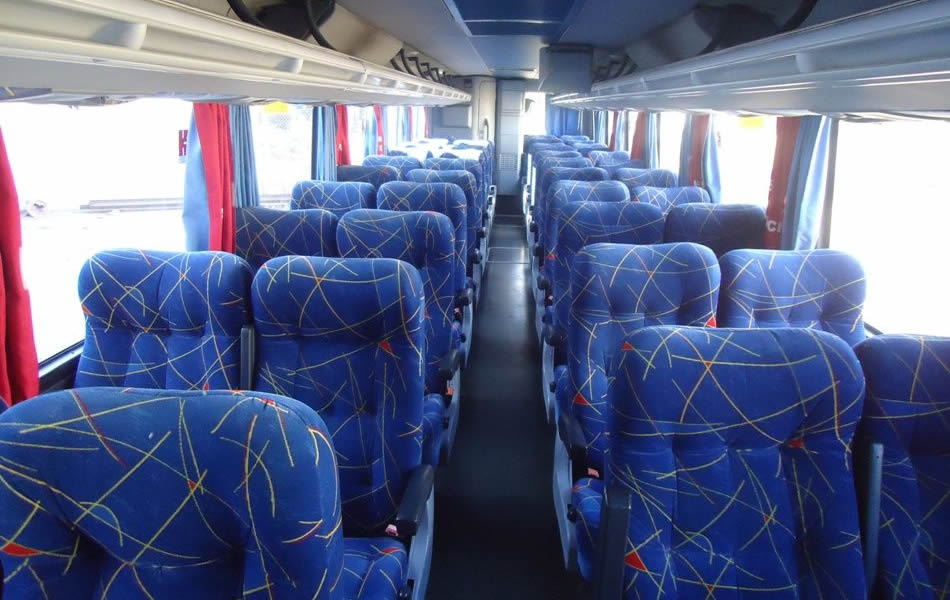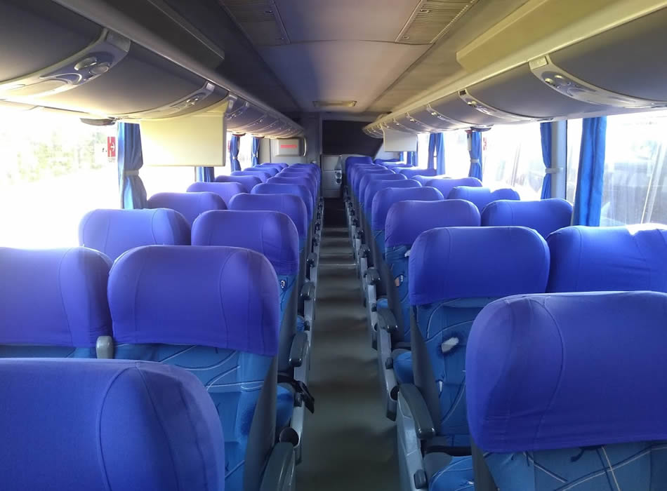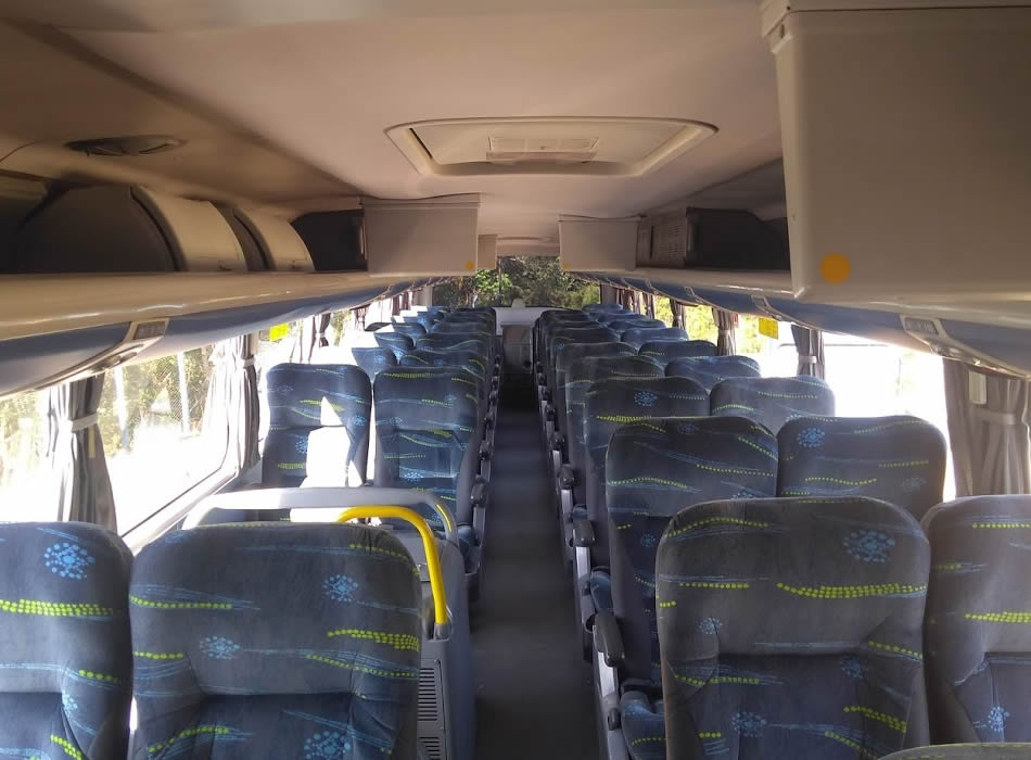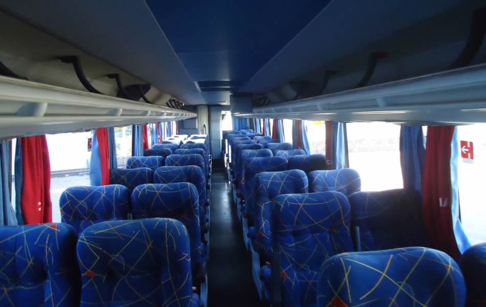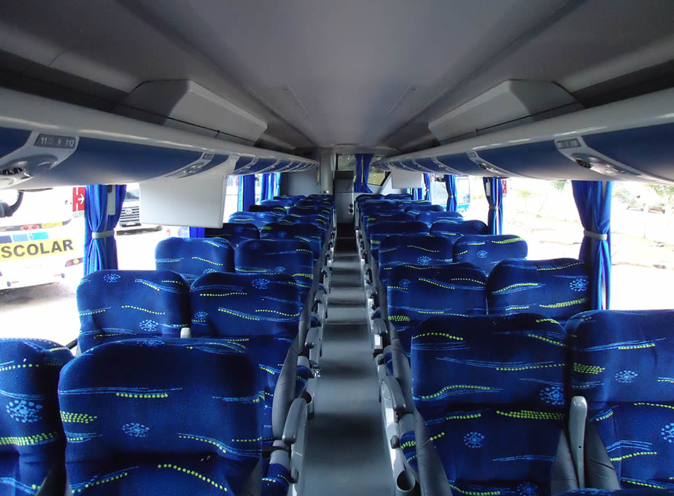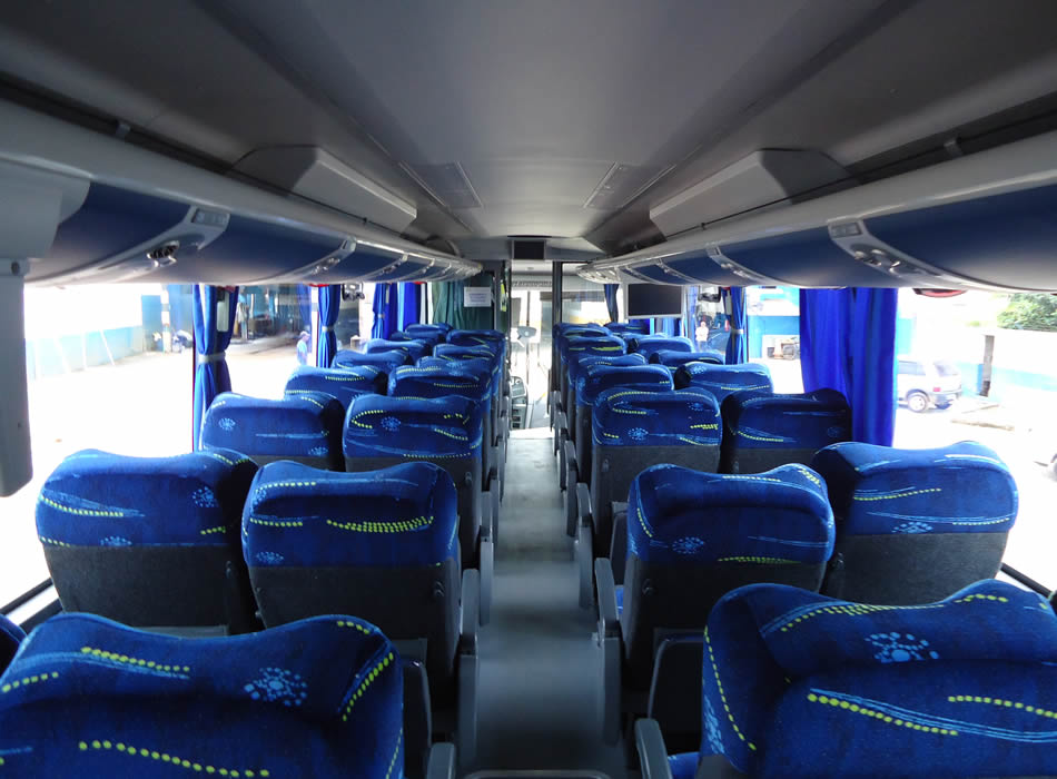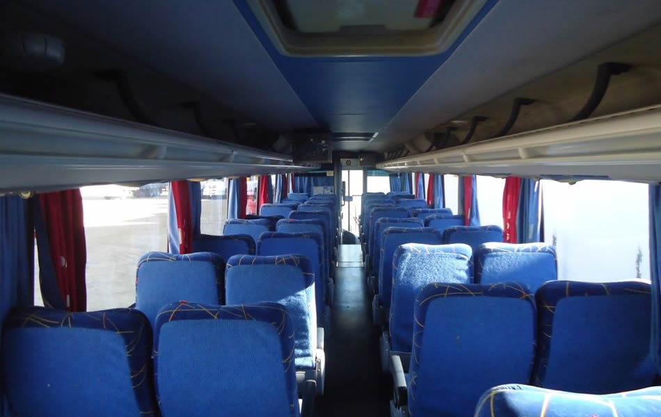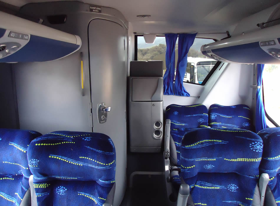 - 46 lugares, ar-condicionado, WC,cd Player, som independente para o salão de passageiros, poltronas reclináveis,monitores TV com DVD, janelas panorâmicas com película fumê, geladeira.