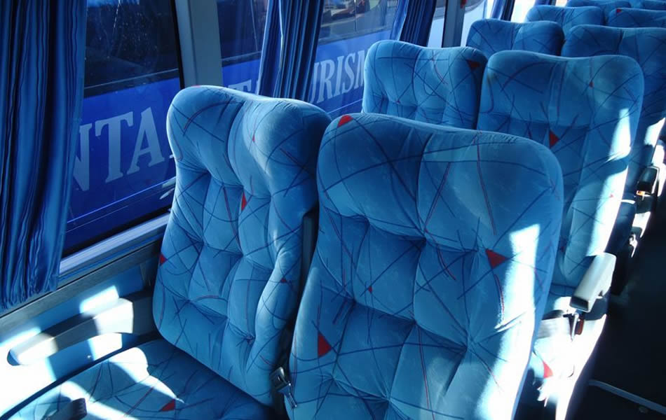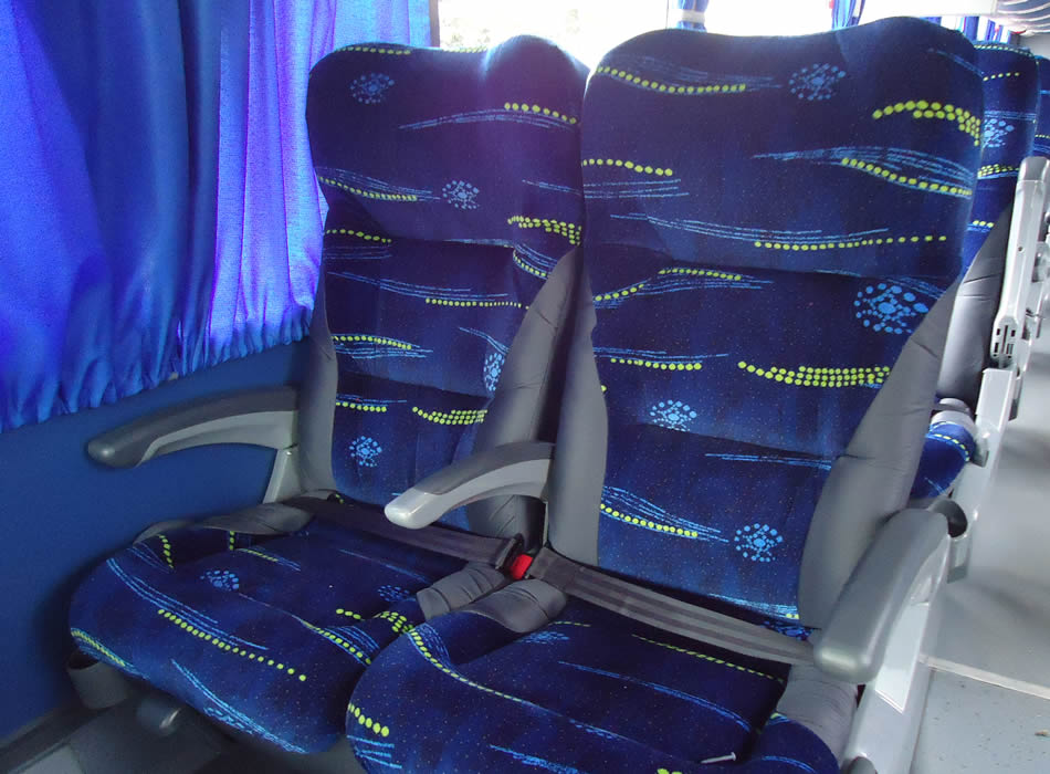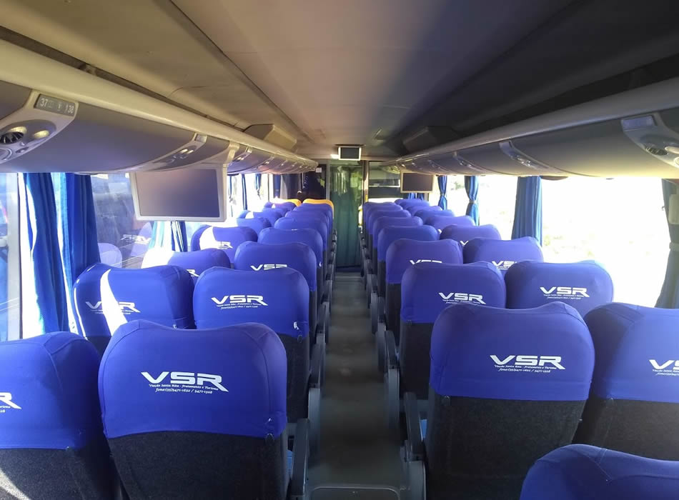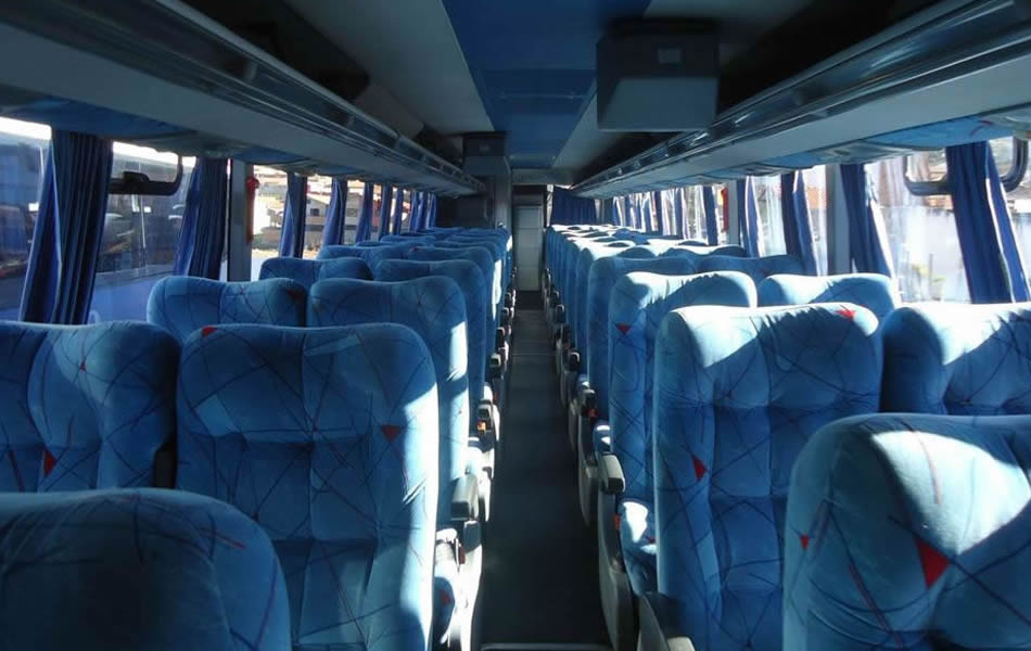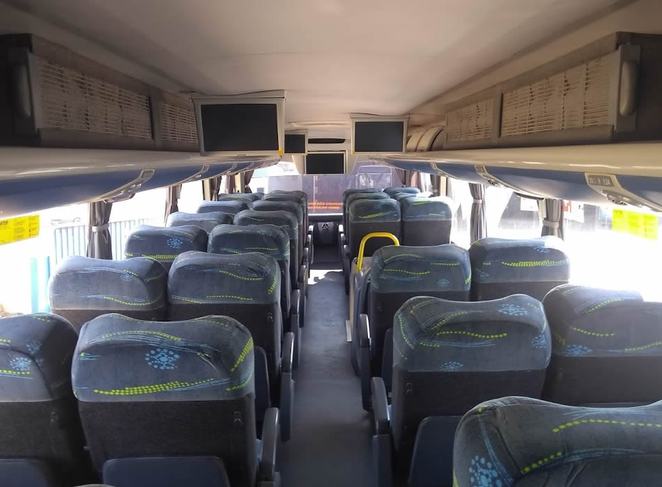 - 46 lugares, ar-condicionado, WC,cd Player, som independente para o salão de passageiros, poltronas reclináveis, monitores TV com DVD, janelas panorâmicas com película fumê, geladeira.